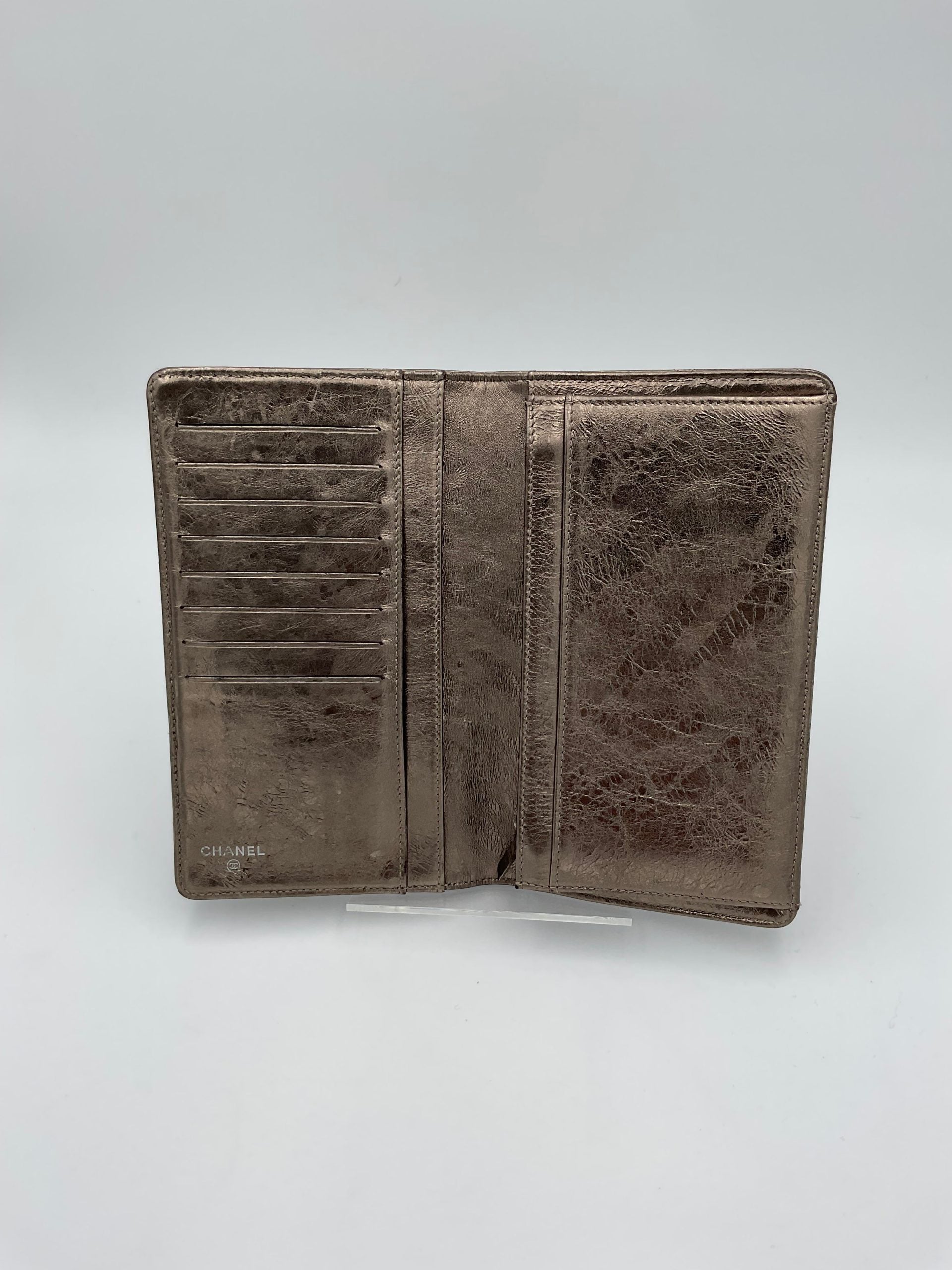 CHANEL wallet, Limited Edition version in metallic platinum-colored calfskin Spacious and versatile interiors. Many pockets for coins and cards. A safe investment in one of the brands that has greatly increased its value in the last decades.