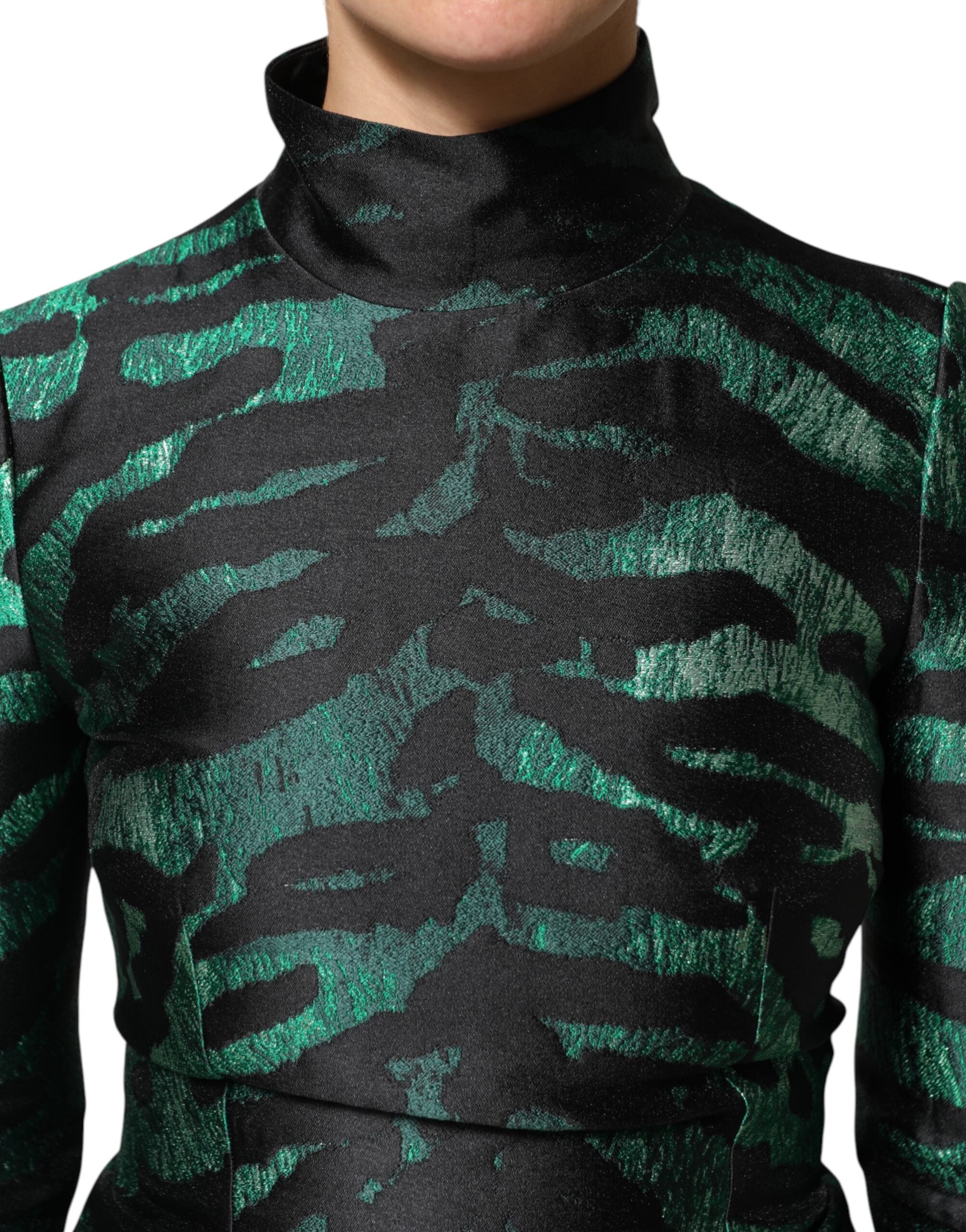 Gorgeous brand new with tags, 100% Authentic Dolce & Gabbana dress. This elegant mini dress is crafted in a striking black and green metallic jacquard pattern with a structured silhouette, long sleeves, and a chic high neckline. Perfect for evening occasions and statement looks.